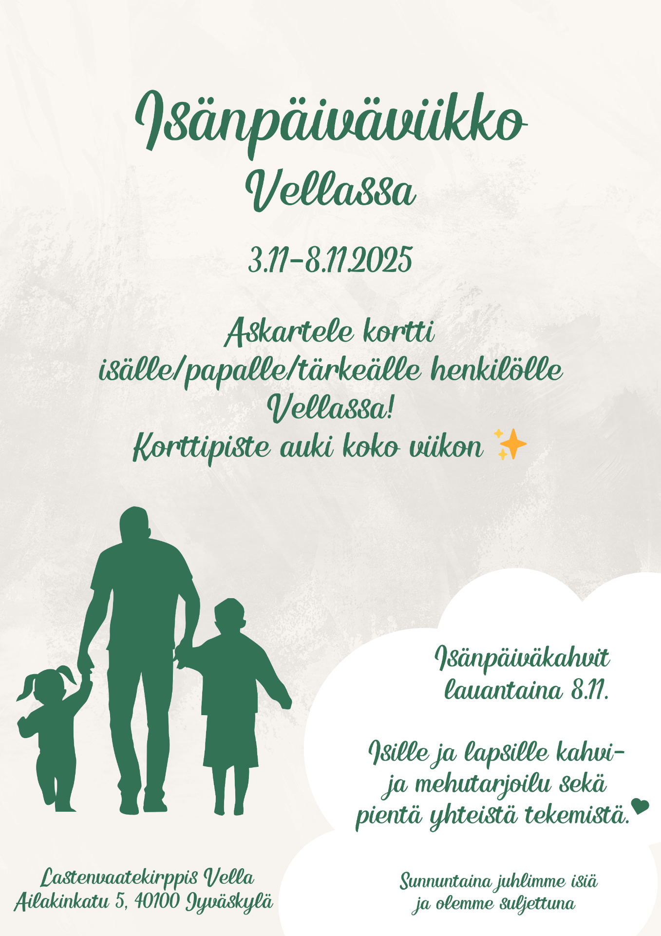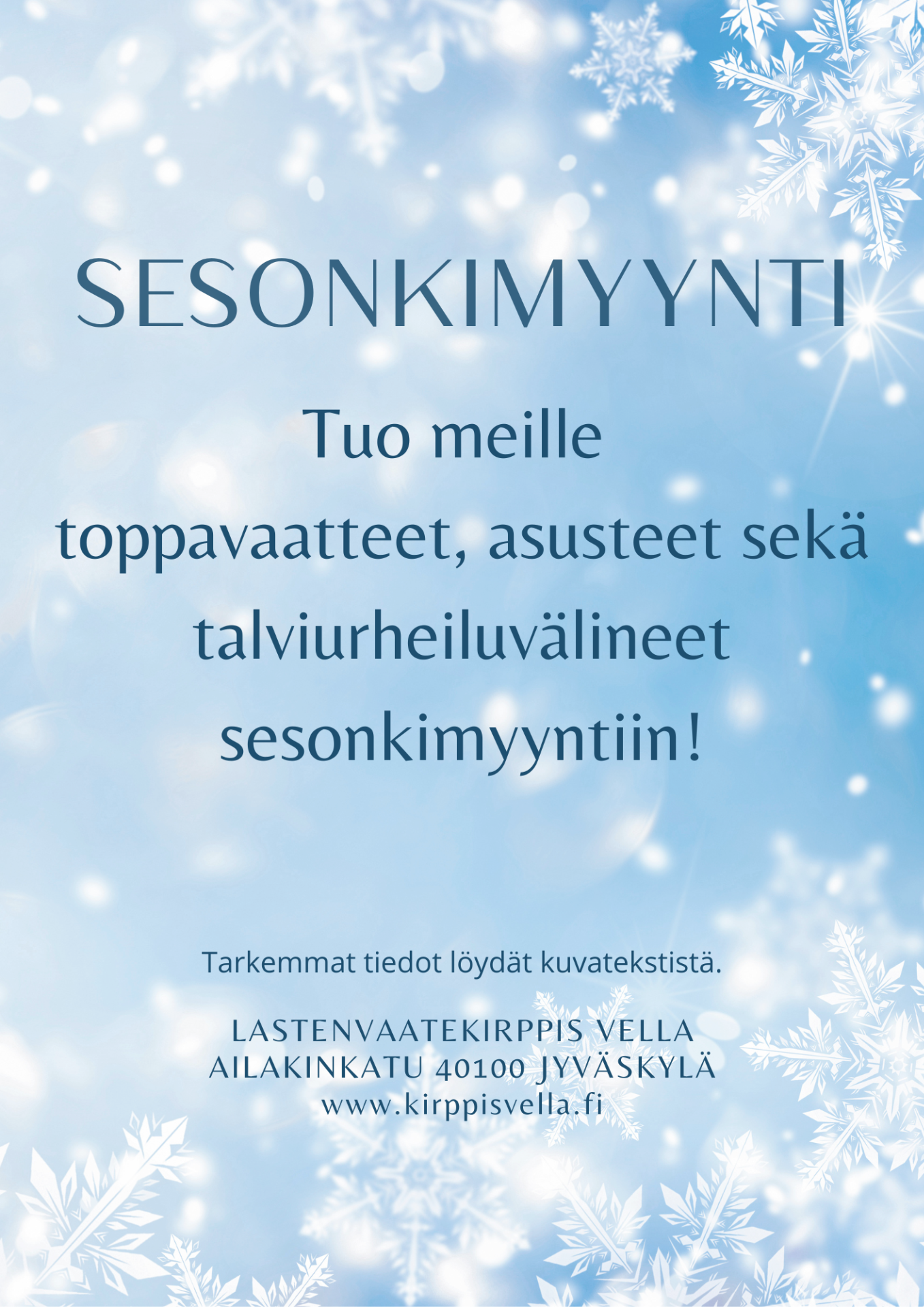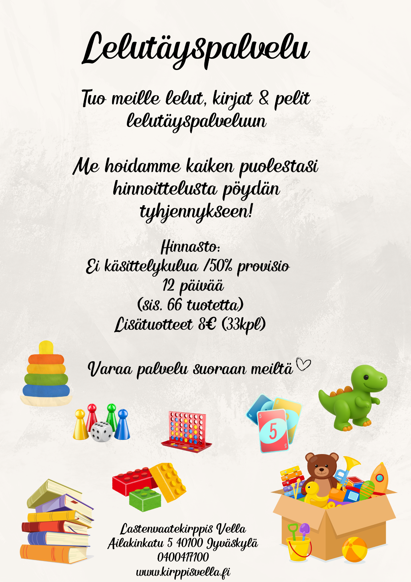 Hei! Olemme lastenvaatteiden ja -tarvikkeiden kirppis Jyväskylän Tourulassa. Meiltä löydät vaatteita pikkuvauvasta nuorisoon koossa 44-170 sekä aikuisten vaatteita! Meiltä löytyy 80 myyntipaikkaa, lasten leikkihuone, tuotemyyntialue, kahvio sekä yhteismyyntialueet. Palveluitamme ovat itsepalvelumyynti, täyspalvelu, drop-in palvelu sekä isojen tuotteiden myyntipalvelu. Meidän kautta kierrättäminen on helppoa ja vaivatonta, sillä palveluiden hintaan kuuluu aina pöydän päivittäinen siivous, markkinointi sekä esillelaittovälineitä. Vellassa voit myydä myös aikuisten vaatteita ja sisustustavaraa tietyin ehdoin.