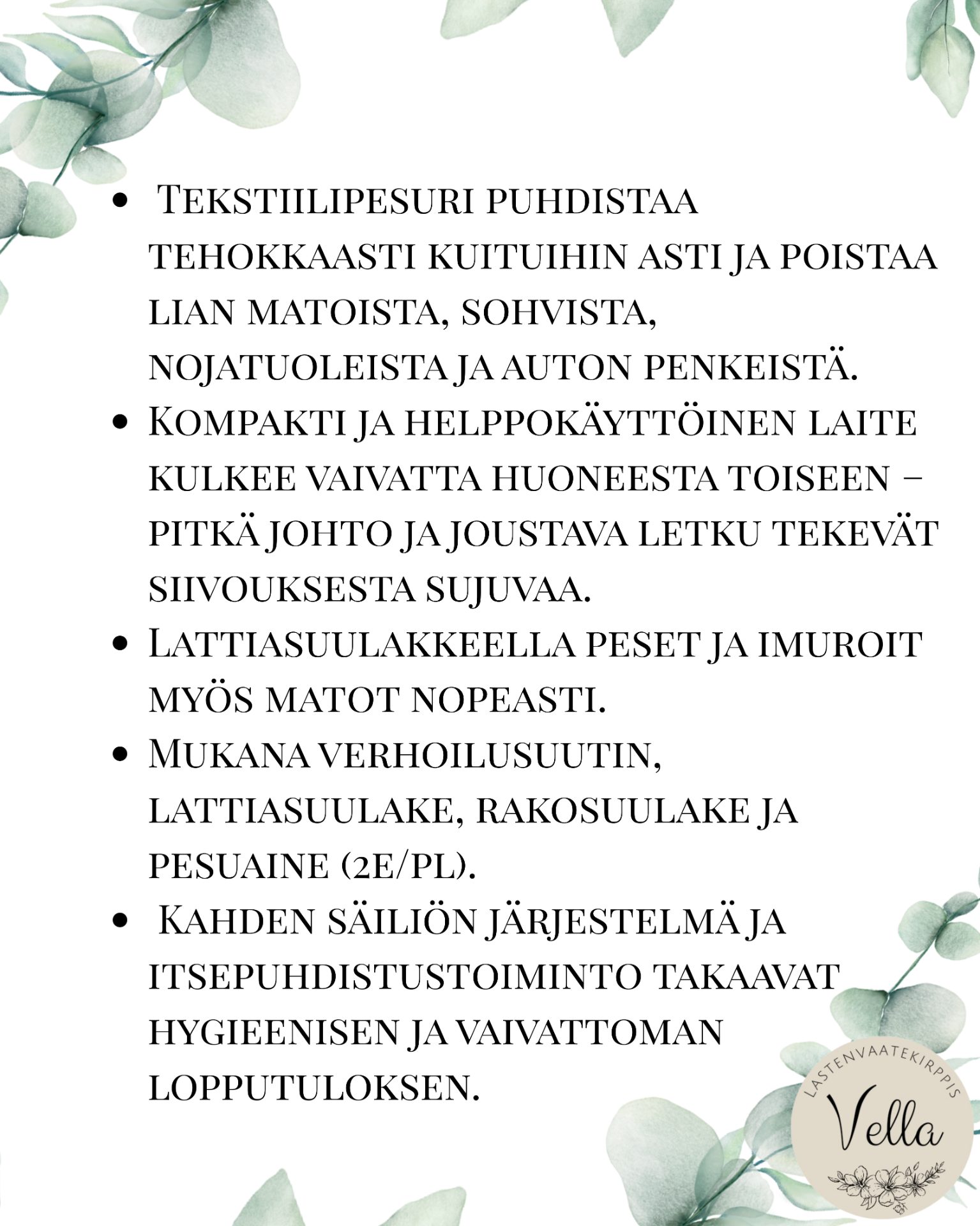 - Tekstiilipesurin voi noutaa Vellasta aloituspäivänä klo 11 alkaen ja palautus tehdään Vellaan seuraavana päivänä viimeistään klo 10.30
